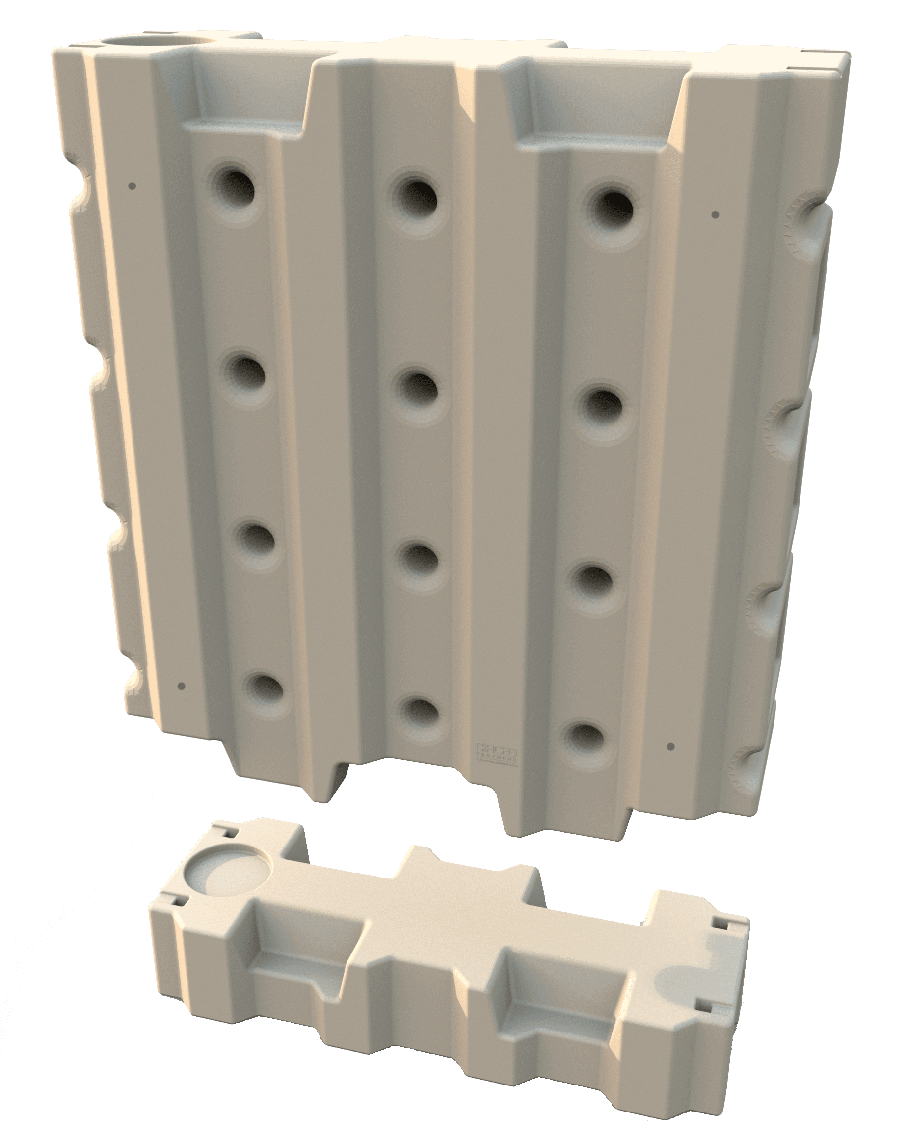 The modules and base are interconnected and allow water to flow horizontally and vertically.